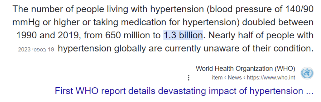 על פי הנתונים המסחררים של ארגון הבריאות העולמי (WHO) כ1.3 ביליון אנשים חיים בעולם עם לחץ דם אשר בהגדרתו נמצא מעל הנורמה.