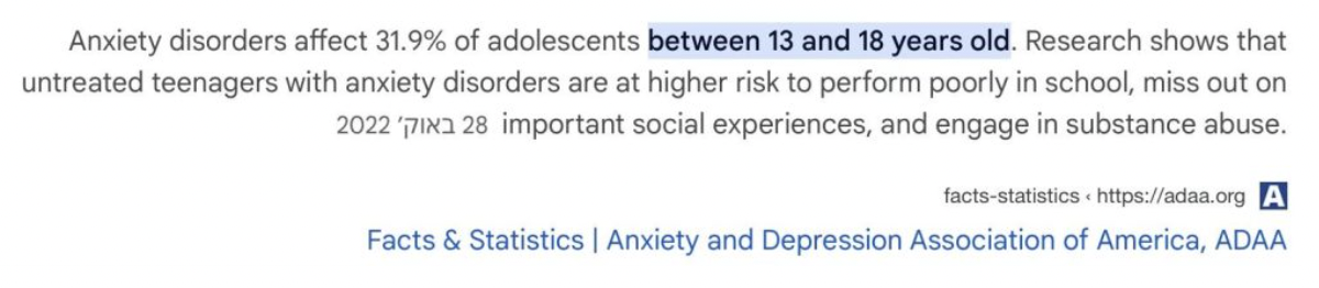 תמונת המצב על פי ארגוני בריאות בעולם מלמדת כי קבוצת הגיל שבה חרדתיות שכיחה ביותר היא גיל הנעורים, קרי בין הגילאים 13-18, מדוע? שתי סיבות עיקריות: זהו הגיל בו אנו מתחילים להחשף לעולם ומפתחים מודעות לאתגרי החיים השונים אך עדיין לא בנינו כלים להתמודדות, תגובה מידתית או במקרים רבים חוסר הבנה של התחושות אותן אנו חווים. הפקטור השני הוא שהחסרים המצטברים מגיעים לידי ביטוי בתהליך נצבר, דפוסים כגון תזונה לא מאוזנת ובריאה או הרגלי חיים לא בריאים שעלולים להשפיע לרעה על רמות הדופמין, ונוירוטרנסמיטרים חיוניים לבריאות הנפש, המוח שינה בריאה ועוד מתחילים לצוף בגילאים אלו.